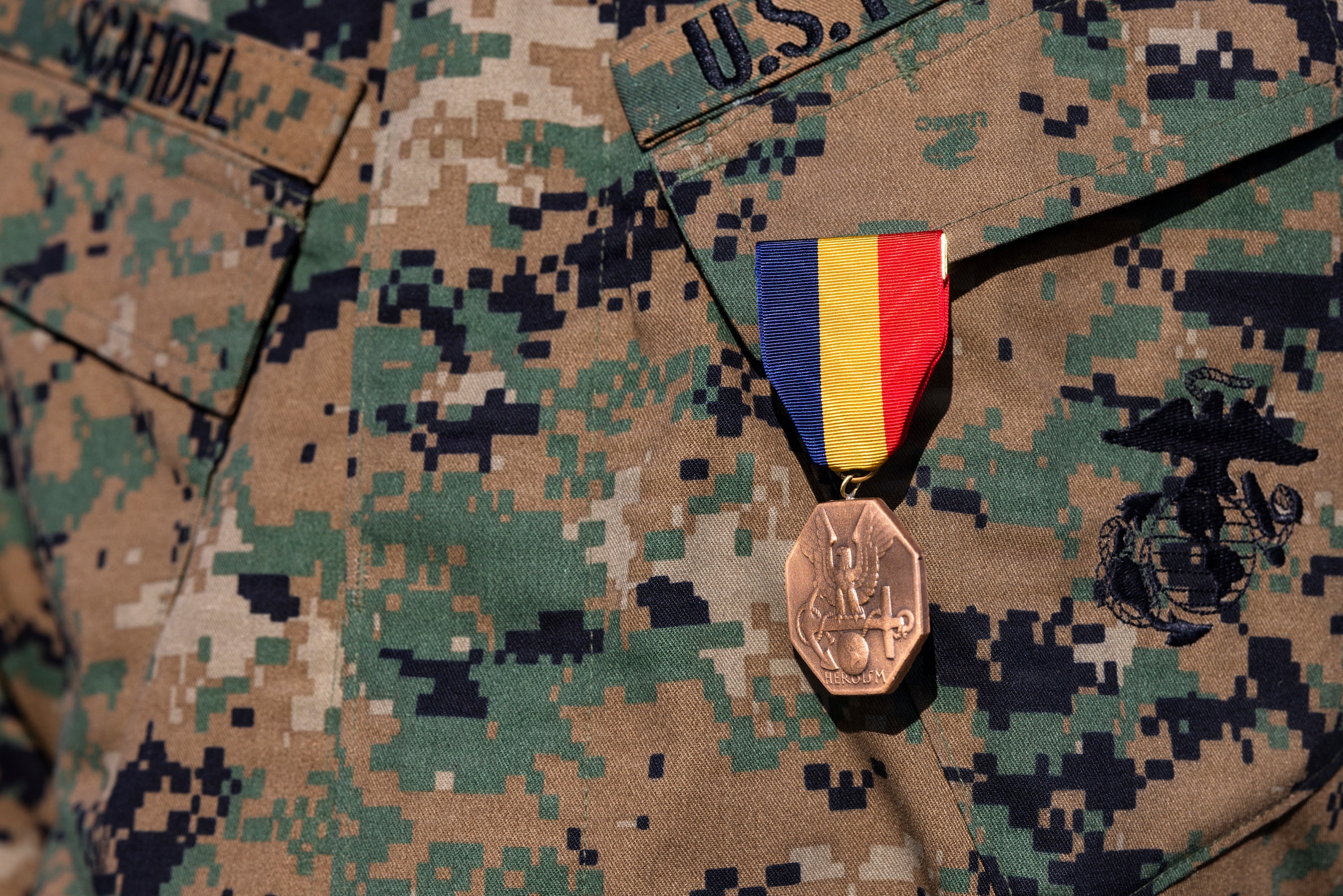 U.S. Marine Corps Staff Sgt. Billy Scafidel, an armory chief with 7th Engineer Support Battalion, 1st Marine Logistics Group, is awarded a Navy and Marine Corps Medal on Marine Corps Base Camp Pendleton, California, Feb. 6, 2026, for his heroic actions of saving a Marine's life from a severe vehicle accident. Scafidel’s actions are an example of selflessness and valor, earning a Navy and Marine Corps Medal, the highest non-combat decoration awarded for heroism by the United States Department of the Navy to members of the United States Navy and United States Marine Corps. (U.S. Marine Corps photo by Sgt. Mary Torres)