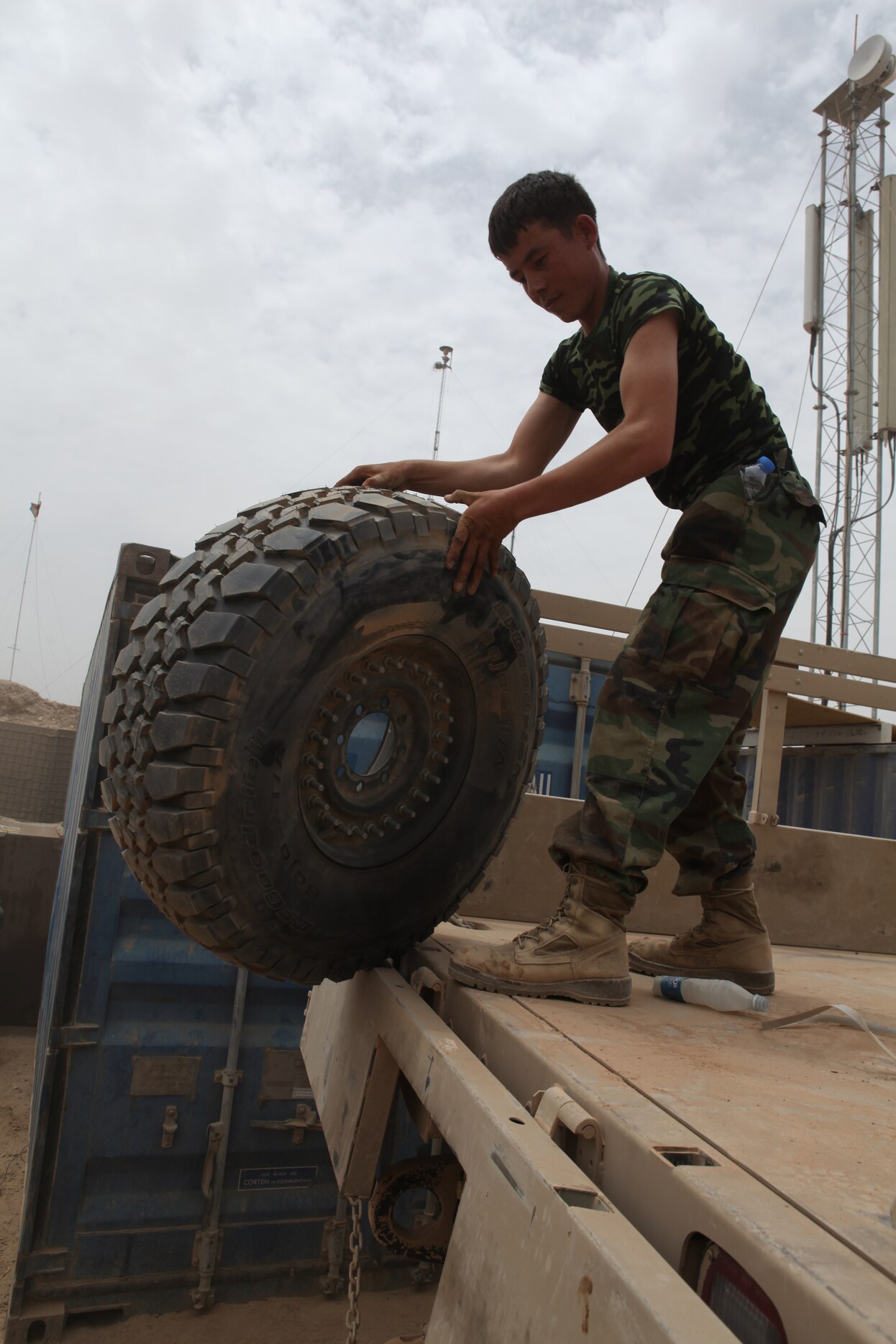 An Afghan soldier with the 5th Kandak, 1st Brigade, 215th Corps, partnered with Combat Logistics Battalion 5, Embedded Partnering Team, 1st Marine Logistics Group (Forward) unload their vehicles after completing a resupply convoy to Forward Operating Base Marjah, Afghanistan, July 26. The CLB-5 EPT trains and mentors soldiers of the Afghan National Army to provide logistical capabilities in support of the International Security Assistance Force.
